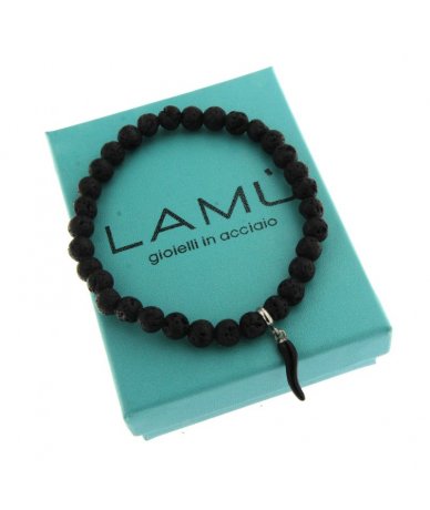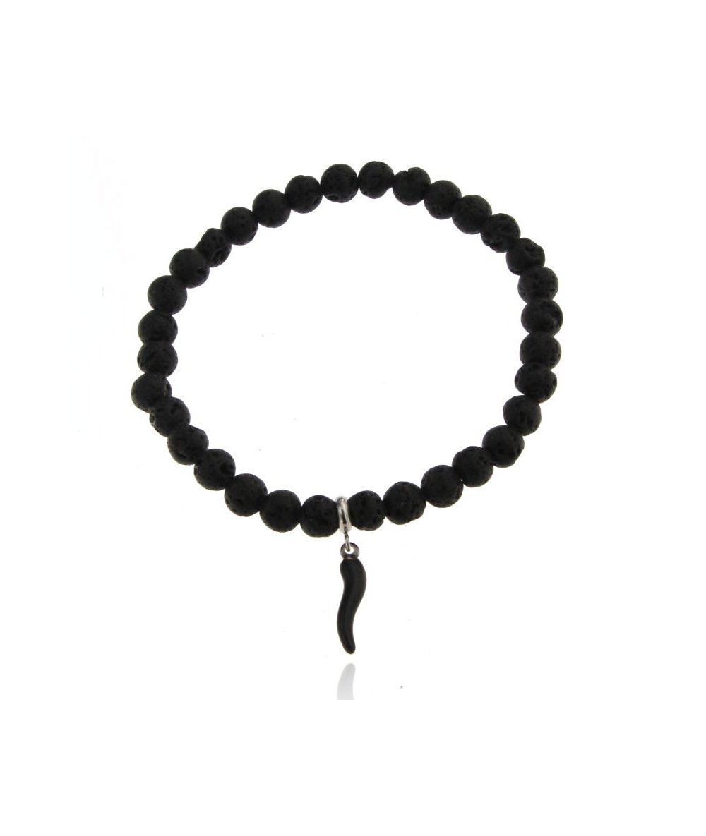 Bracciale uomo elastico con sfere nere in pietra lavica pendente cornetto nero in acciaio