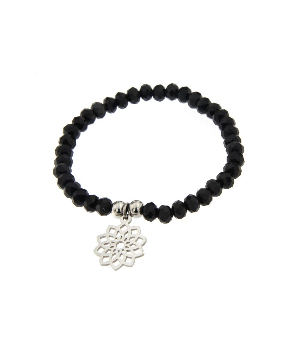 Bracciale elastico di sfere sfaccettate in vetro colore nero e charm rosone traforato in acciaio inox