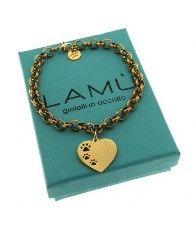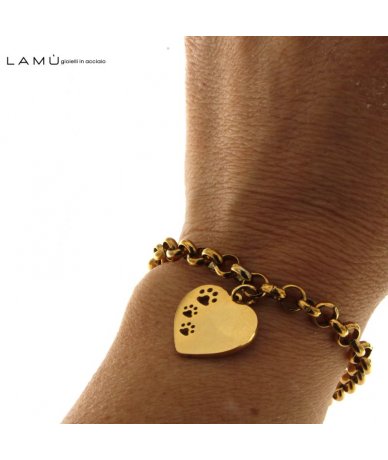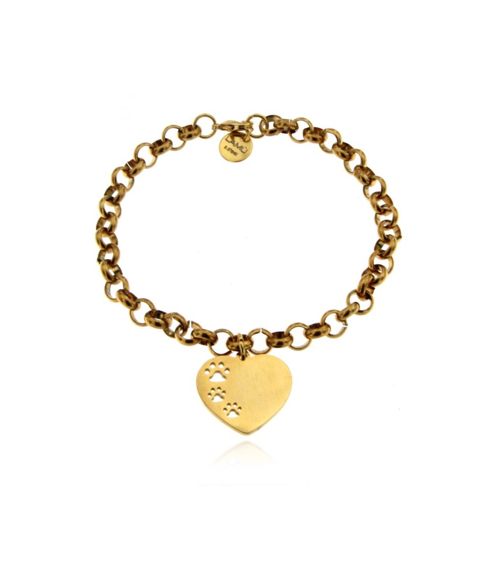Bracciale catena ad anelli in acciaio inox con cuore con orme incise finitura oro