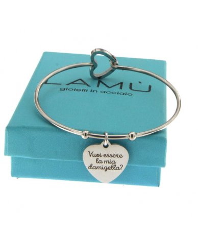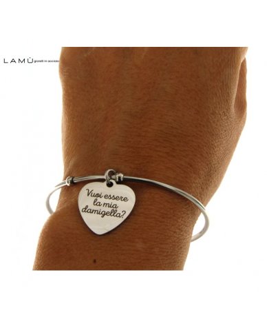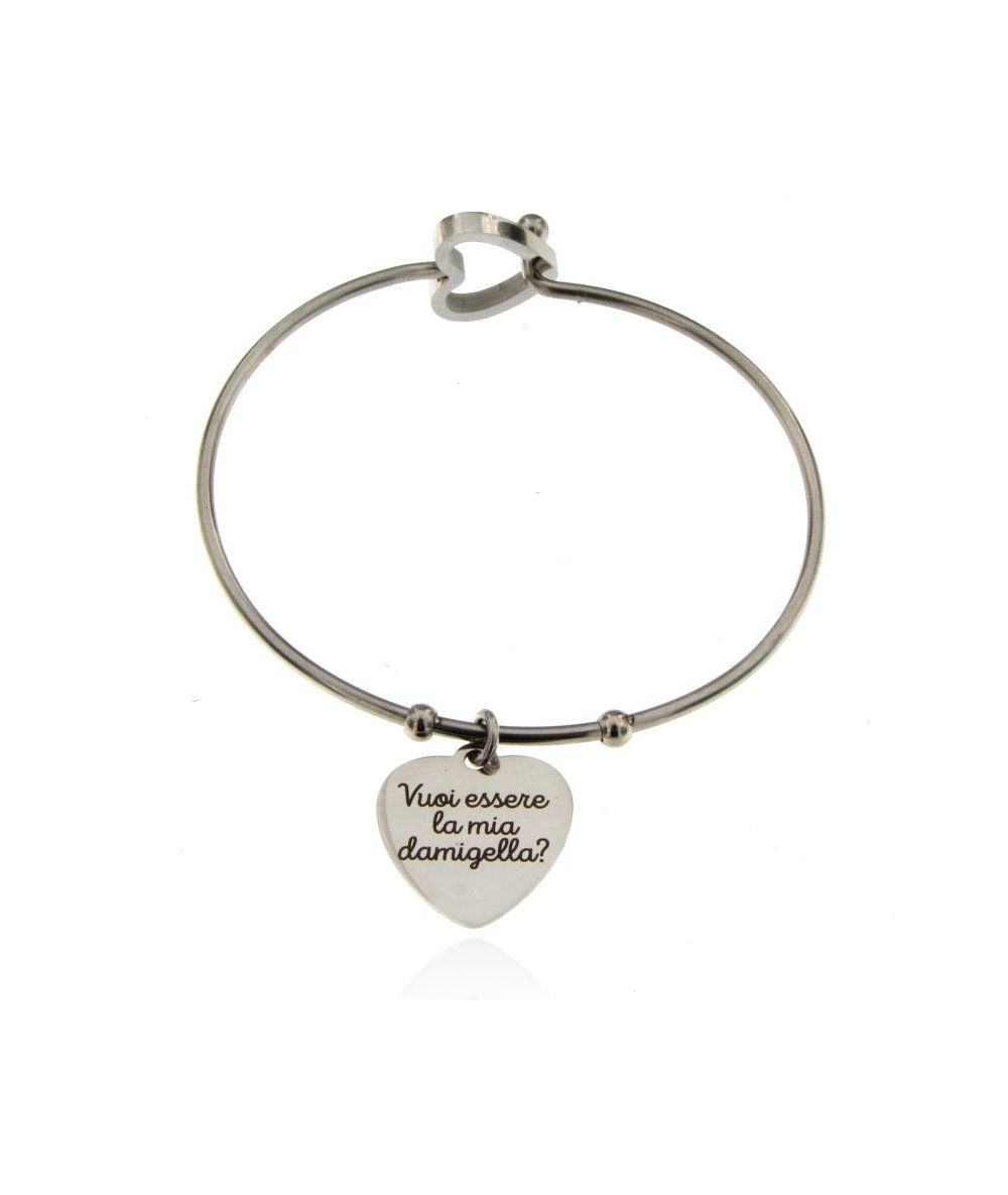 Bracciale rigido in acciaio inox con cuore inciso "Vuoi essere la mia damigella?"