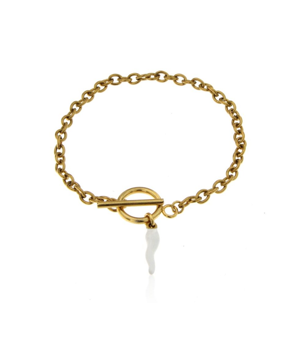 Bracciale con pendente cornetto smaltato bianco in acciaio inox finitura oro
