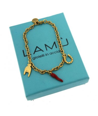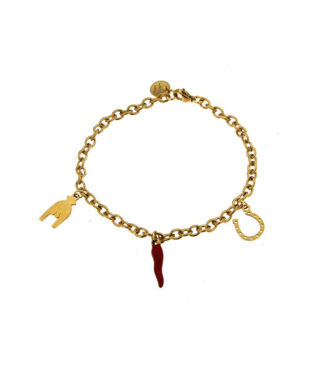 Bracciale oro con pendenti corna ferro di cavallo e cornetto rosso