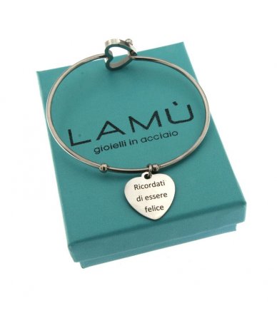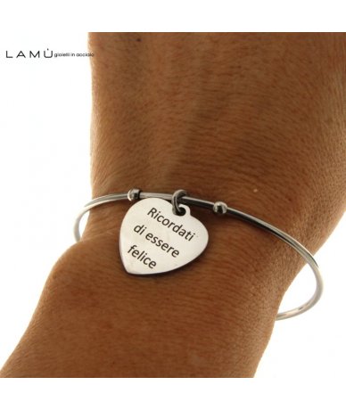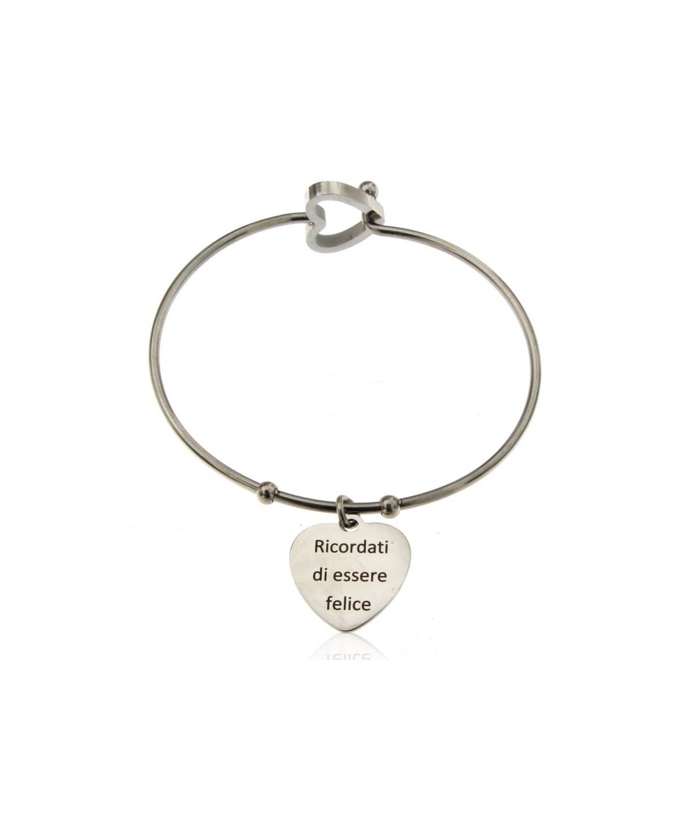 Bracciale rigido in acciaio inox con cuore inciso "Ricordati di essere felice"