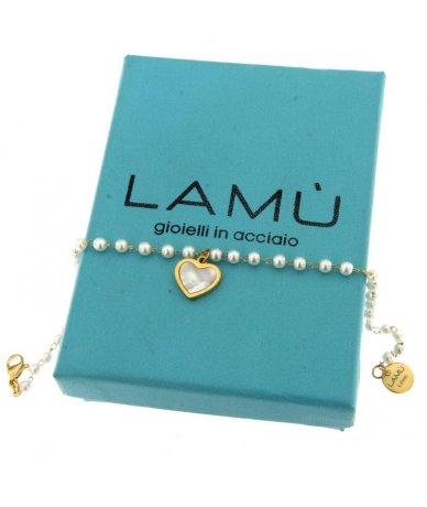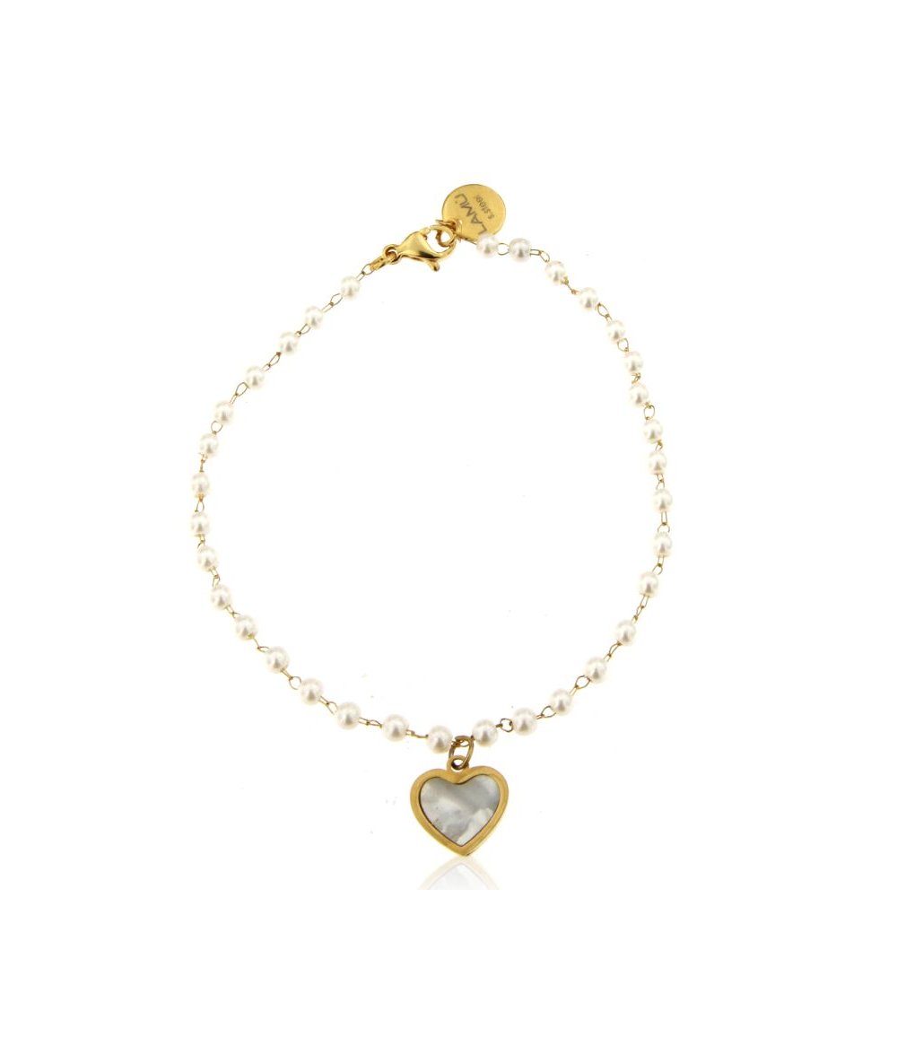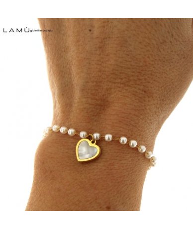 - Bracciale in acciaio inox oro e perline bianche con pendente cuore in conchiglia