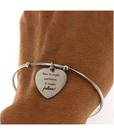 Bracciale rigido in acciaio inox con cuore inciso "Non ti voglio perfetta, ti voglio felice"
