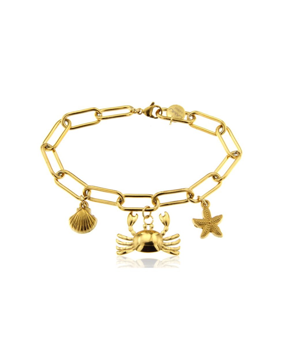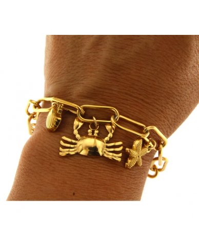 Bracciale in acciaio inox placcato oro 18k con granchio conchiglia e stella marina
