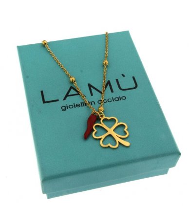 Collana in acciaio inox finitura oro con catena sfere e pendenti quadrifoglio e cornetto rosso