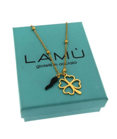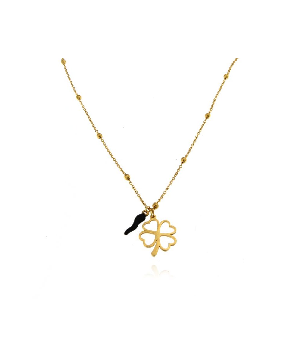 Collana in acciaio inox finitura oro con catena sfere e pendenti quadrifoglio e cornetto nero
