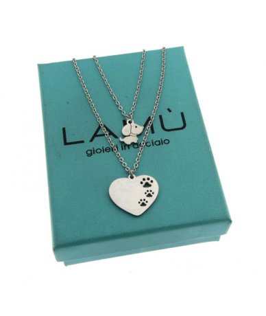 Collana doppia catena con cuore con orme incise e piccolo cane in acciaio inox - Lamù gioielli