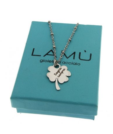 Collana in acciaio inox con pendente quadrifoglio inciso "Sogna sempre"