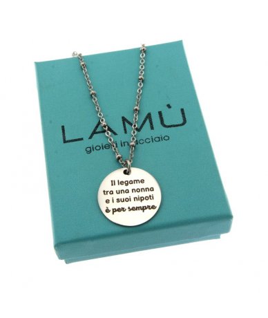 Collana in acciaio inox con pendente tondo inciso "Il legame tra una nonna e i suoi nipoti è per sempre"