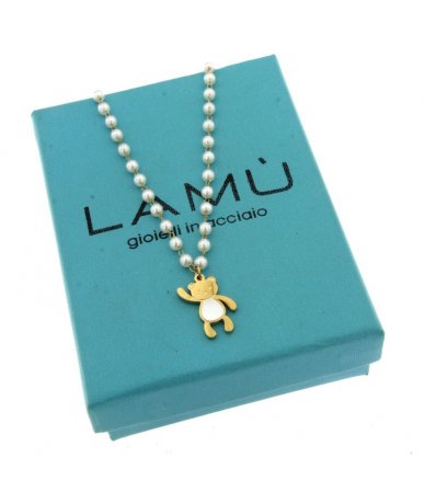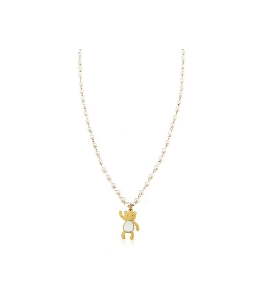 Collana in acciaio inox oro e perline bianche con pendente orsetto