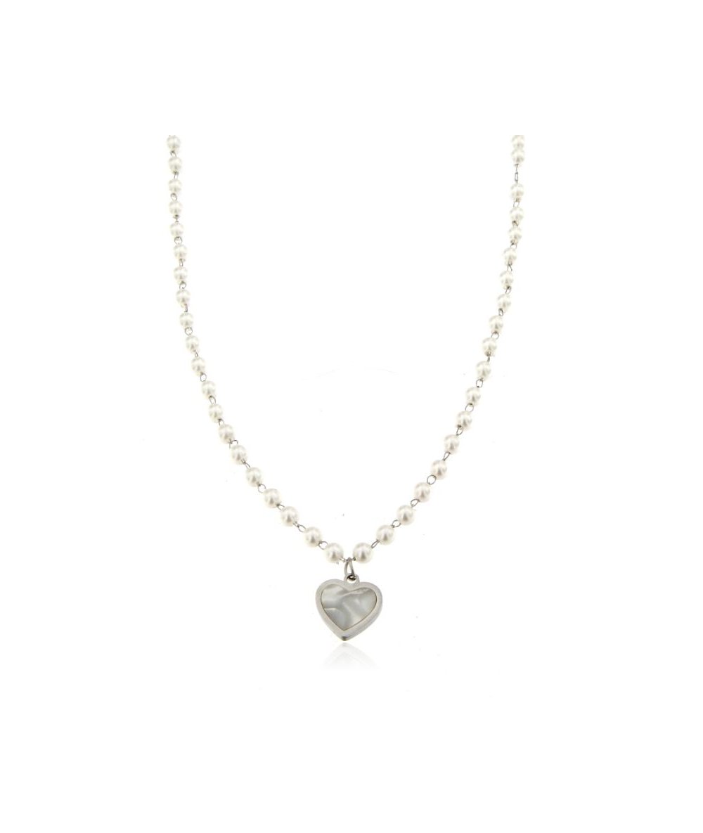 Collana in acciaio inox e perline bianche con pendente cuore in conchiglia