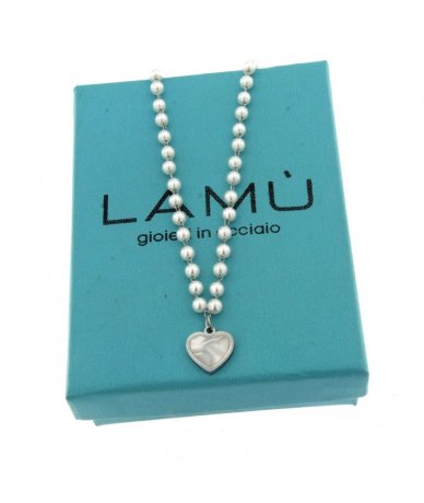 Collana in acciaio inox e perline bianche con pendente cuore in conchiglia - Lamù Gioielli
