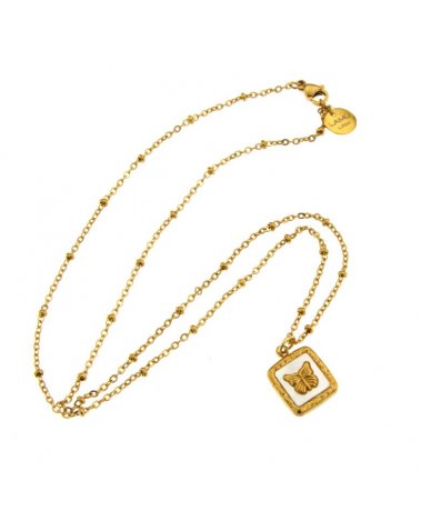 Collana con medaglietta smaltata bianca con farfalla in acciaio inox oro 18k