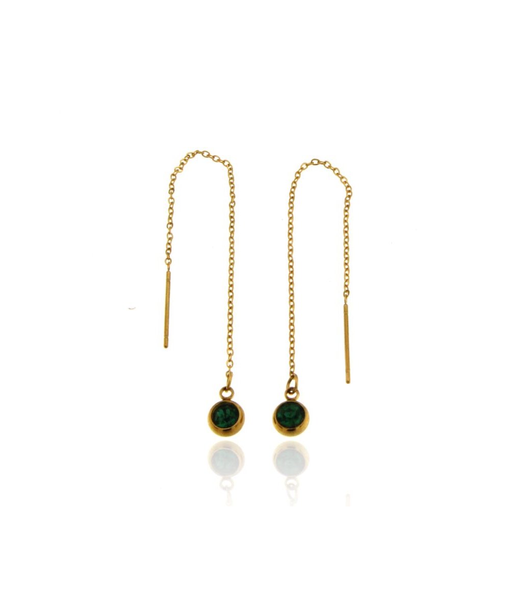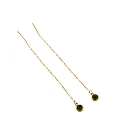 Orecchini lunghi saliscendi in acciaio inox oro con punto luce verde