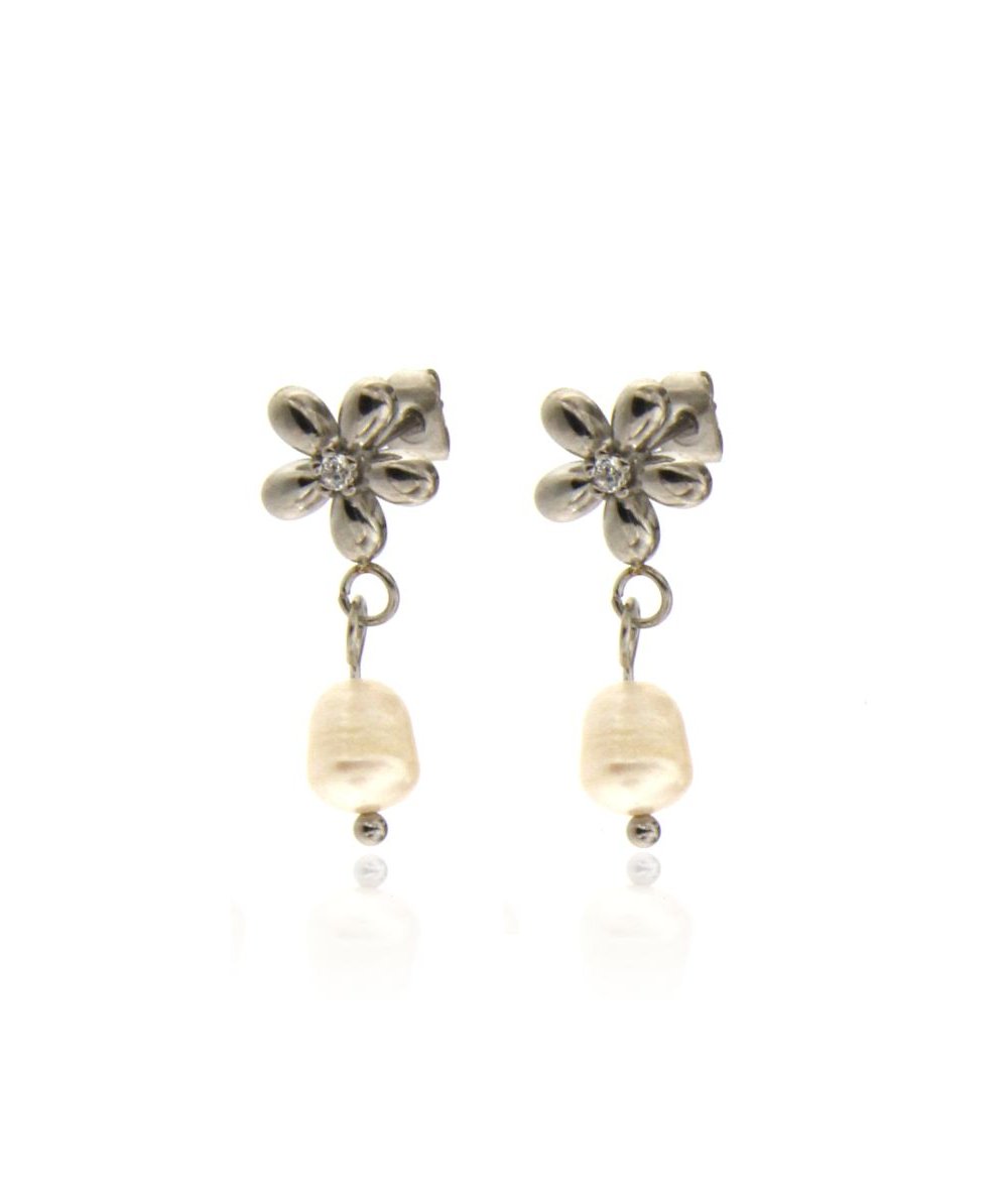 Orecchini margherita con centrale zircone e con pendente perla in acciaio inox