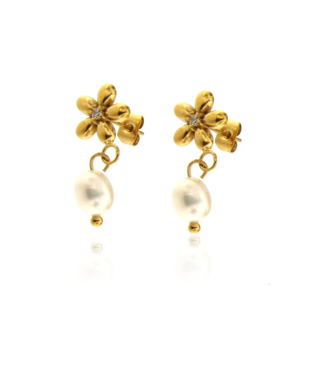 Orecchini margherita con centrale zircone e con pendente perla in acciaio inox placcato oro 18k