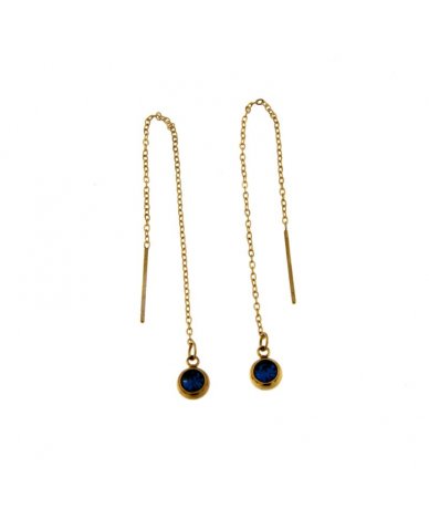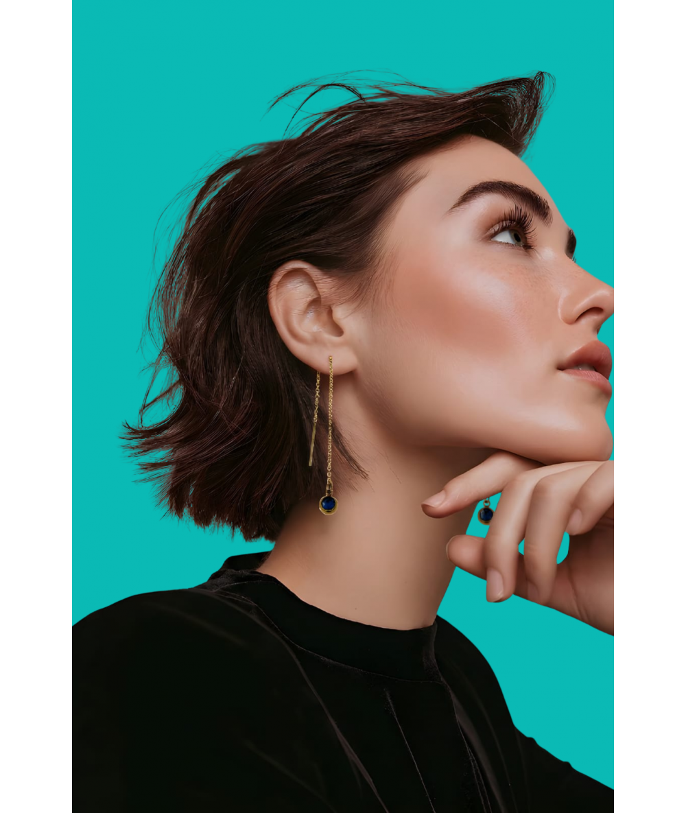Orecchini lunghi saliscendi in acciaio inox oro con punto luce blu